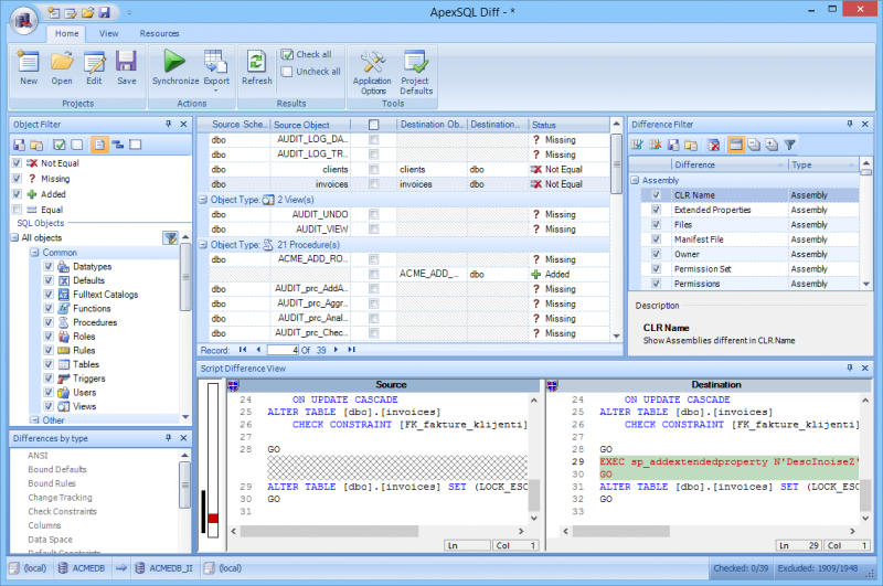 ApexSQL Diff is an SQL development tool that can compare SQL Server database tables, views, and all other SQL Server objects. Beside comparing and synchronizing live databases, it can also compare and synchronize native backups, ApexSQL snapshots, script folders, and source control projects. It supports Azure SQL Database and SQL Server on Amazon RDS. Database schema synchronization can be automated and scheduled unattended. Upon finished comparison, you?ll be able to export results into HTML, XML, and Excel. It also supports creating executable installation packages that user can run without installing any other software.