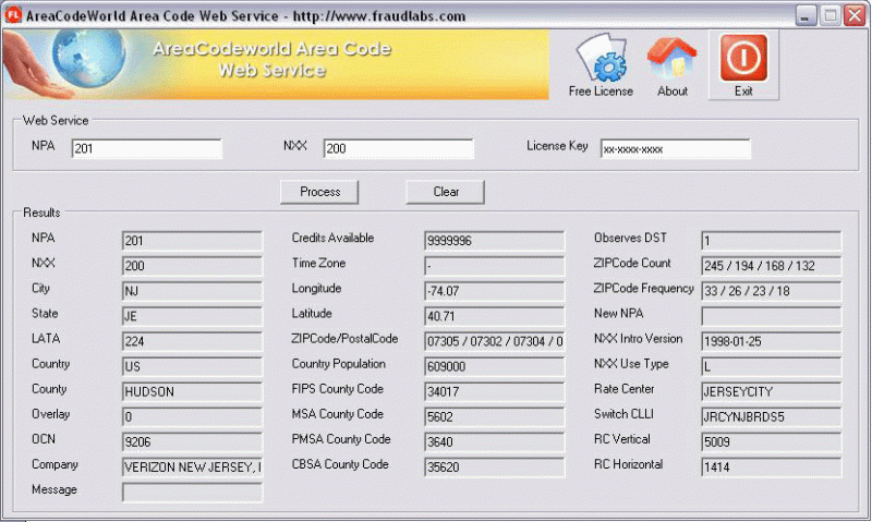 AreaCodeWorld Desktop is a free standalone Windows application that allows instant detection of geographical data in US, Canada and Caribbean by using area Code search. Users can perform 90 queries per month using Free account. Please visit http://www.fraudlabs.com for more information.
