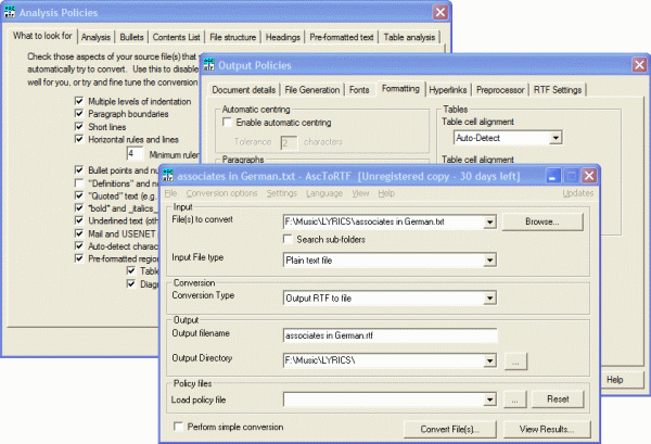 A powerful and highly configurable utility that converts plain text files into rich text (RTF). Based on the same highly praised text analysis engine as AscToHTM, it recognises headings, bullets, indentation levels, tables and much more. Full table generation is attempted on detected tables, and you can define how you want each table laid out. Hyperlinks can be added to section numbers, URLs, email addresses, etc. The software recognises many different types of headings, and these are marked up in Heading styles, allowing Word to incorporate them into the TOC. The user can choose the fonts to be used, and supply title, keywords etc. for insertion into the document properties header. From version 2.0 onwards the software can create RTF files suitable for conversion into WinHelp files, and will even create the Help project file for you (it created it's own Help file). The software comes with many options to customize the output which can be saved to "policy files" and reloaded at a later date. The software supports the use of wildcards, and can be used for batch conversion. Registered users get access to a console version that is better suited for batch conversions. Developers may care to investigate the API version, which can be integrated into their own software. The API is sold under separate license, contact us for details. A great time saver for novice and expert alike, awarded several 5 stars reviews