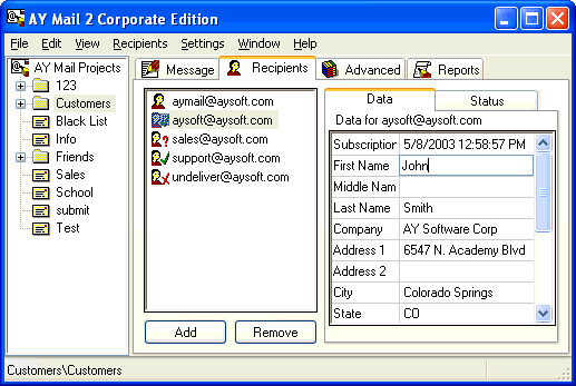 Customizable emailing software used by government, universities and businesses around the world. Easy and versatile import from Outlook, Netscape, Mozilla, Thunderbird, Eudora, ODBC, SQL, Exel, Access etc, ability to send directly from external data sources, automatic removal of duplicate addresses, fast multithreaded email address verification, text or HTML messages, built-in HTML editor, HTML templates, mail merge, spell checker, active scripting, real time preview, flexible sending, scheduling, subscription forms, automatic letters to new subscribers, automatic bounce processing, click through detection, targeted follow-ups, advanced mailing list management, data export, companion server software and more...Three different editions to fit your needs and budget.