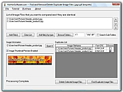 Find and remove duplicate image files! Supports all sorts of different image file formats, such as jpg files, bmp files, gif files, tiff files, plus much more! Some of the features include: * Ability to recursively search directories for identical jpg/image files to delete them all at once * Ability to apply a checksum and check against checksums for image files * Ability to preview the image files (thumbnail images) to ensure that they are actually unique * Ability to open the images in an external preview program to see them, plus much more!