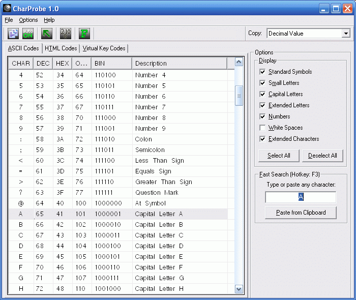 CharProbe allows you to easily find and automatically copy: ASCII Codes, HTML Codes, Virtual Key Codes. You can also export custom tables to TXT or HTML and convert between decimal, hexadecimal, octal and binary numbers.