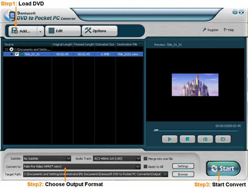 Daniusoft DVD to Pocket PC Converter is a powerful DVD movie to Pocket PC video converter software. It can convert DVD to Pocket PC AVI, WMV, and rip DVD audio to Pocket PC MP3, WMA with excellent quality and super fast conversion speed