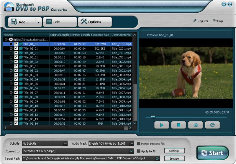 Daniusoft DVD to PSP Converter is a powerful DVD movie to PSP video converter software. It can convert DVD to PSP MP4 video MPEG-4 (H.264/AVC in 480p, 720p, 1080i) and rip DVD audio to PSP music MP3, WMA in a high quality and fast conversion speed.