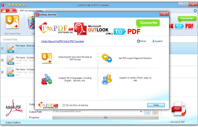 FoxPDF Eml to PDF Converter you can easily convert your Outlook (Eml, MSG, PST) files into PDF documents with no hassles involved. Only drag and drop your Outlook files and it doesn't require Adobe Software while converting Eml file to PDF.