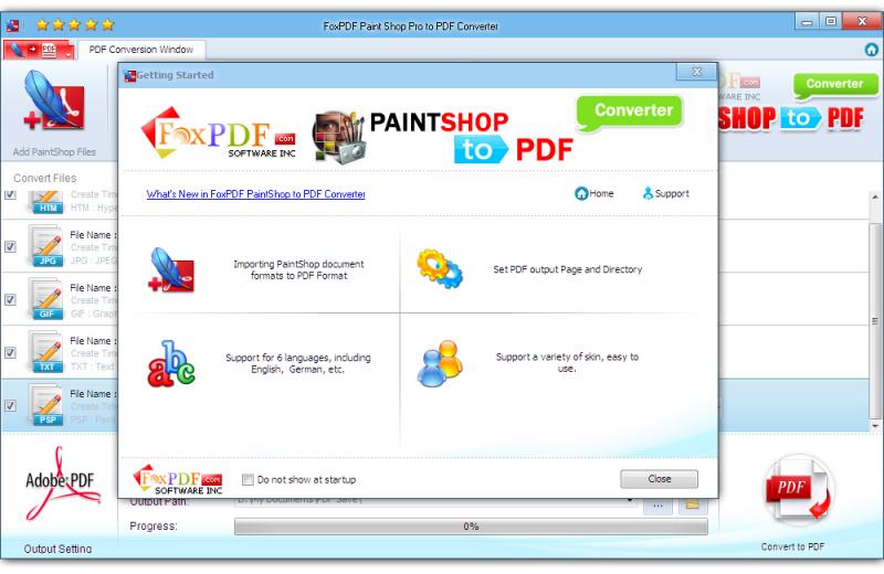 . FoxPDF Paint Shop Pro to PDF Converter supports a wide variety of versions of Paint Shop Pro files, it supports PSP, PCX, GIF, BMP, HTML, HTM and RTF files from all Paint Shop Pro formats;