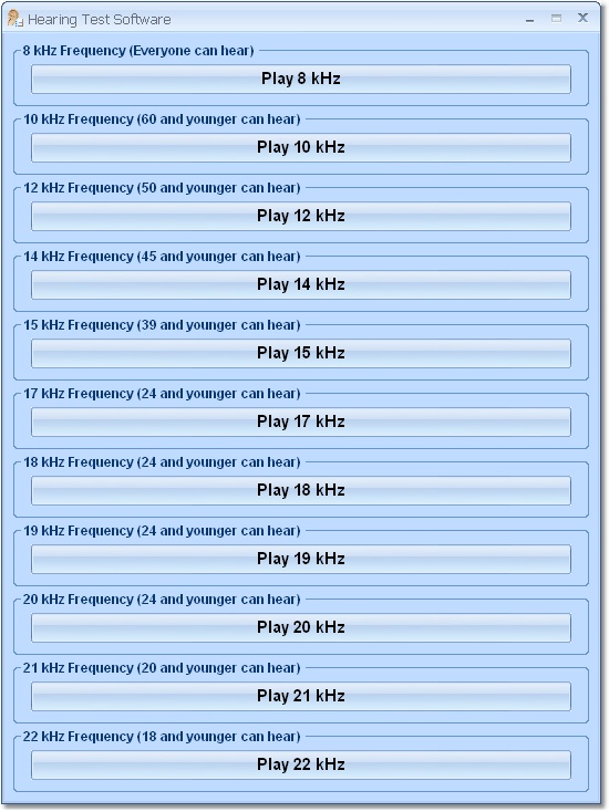 This software offers a solution to users who want to test ears using specific audio frequencies. The higher the frequency, the harder it is to hear.