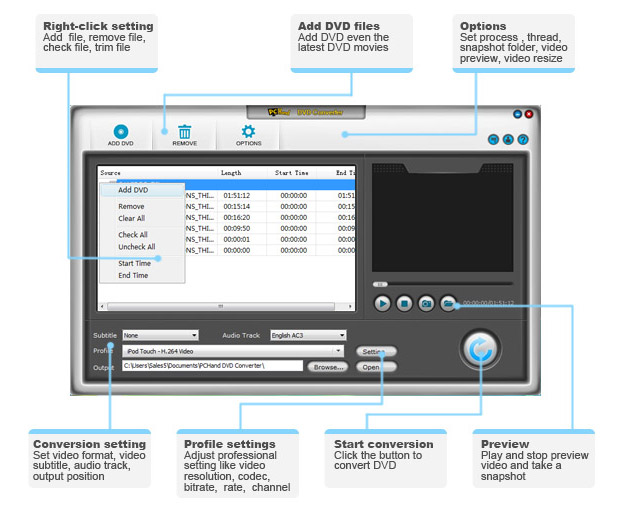 PCHand DVD Converter key feature:1.Rip the latest copy protected DVD movies 2.DVD to SD video without quality loss 3.DVD to HD Video keeping high quality video 4.Extract Audios from DVD and convert to mp3 5.Trim your favorite DVD 6.Play on Various Media Devices