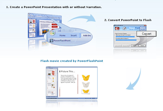 PowerFlashPoint is a PowerPoint plug-in that automatically converts your PowerPoint 2007, XP/2002 & 2003 presentations into a highly compressed Internet-ready presentation in the Macromedia Flash format. Easily distribute your presentations via CD/e-mail to anyone, anywhere. PowerFlashPoint accurately converts your PowerPoint to Flash and retains all of your special effects with upto 98% reduction in file size. It also allows you to create high-quality web banners from PowerPoint. With PowerFlashPoint powerpoint to flash Publisher, anyone can easily create rich-media Flash presentations and interactive online training.