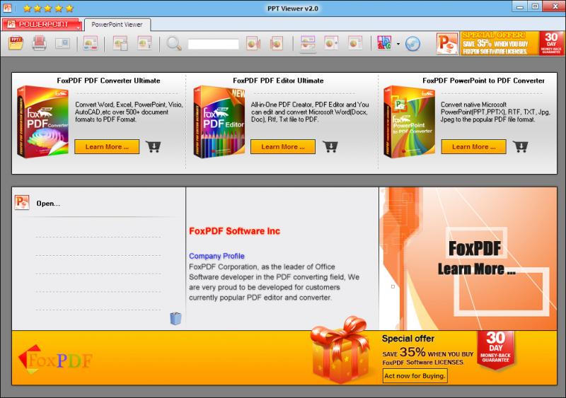 PPT Viewer from FoxPDF lets you open, view PowerPoint PPT, PPTX and Rtf files as well as TXT files and it doesn't require Microsoft PowerPoint. It can run as a desktop application in Windows. It offers a variety of viewing options. PPT Viewer can print normally in your usual app.