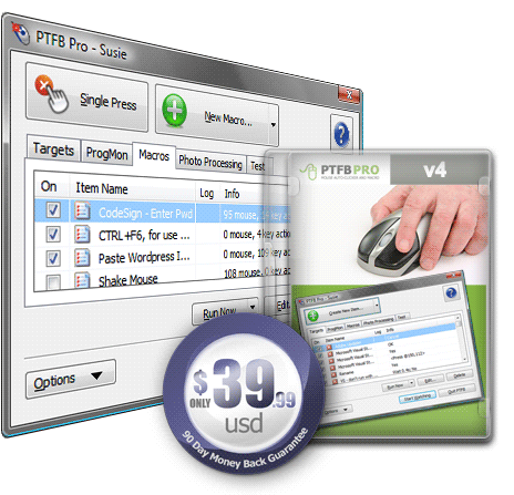 PTFB ProOptimize your workflow with macros - the easy way! Automatically dismiss irritating dialogs, keep programs running smoothly, eliminate repetitive tasks.