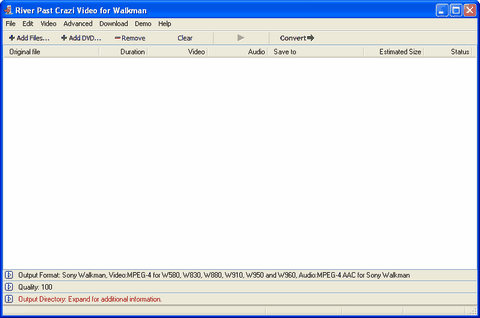River Past Crazi Video for Walkman is the easiest way to convert your video and audio for your Walkman. It accepts a wide range of video formats - 3GPP, 3GPP2, ASF, AVI, DAT (VCD), DivX, DV, FLIC animation, Animated GIF, MKV, MOV, MP4, MPEG-1, OGM, RAM, WMV and Xvid, and output to MPEG-4 video supported by Blackberry. You can also extract audio from those video formats, or convert AC3, AIFF/AIFC, APE, AU, FLAC, MP3, MPA, MPC, MKA, OFR, OGG, RA, SD2, SHN, SND, TTA, WAV and WMA audio to MP4 AAC audio.