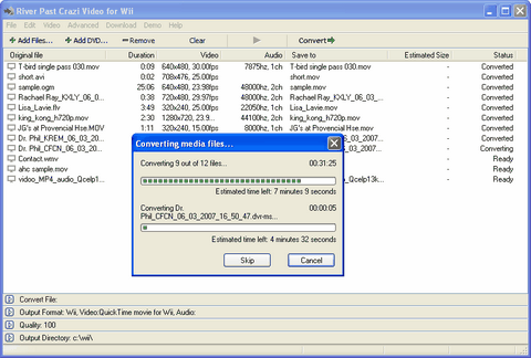 River Past Crazi Video for Wii is the easiest way to convert your video for your Wii. It accepts a wide range of video formats - 3GPP, 3GPP2, ASF, AVI, DAT (VCD), DivX, DV, MKV, MOV, MP4, MPEG-1, OGM, RAM, WMV and Xvid, and output to Wii compatible QuickTime movie files.